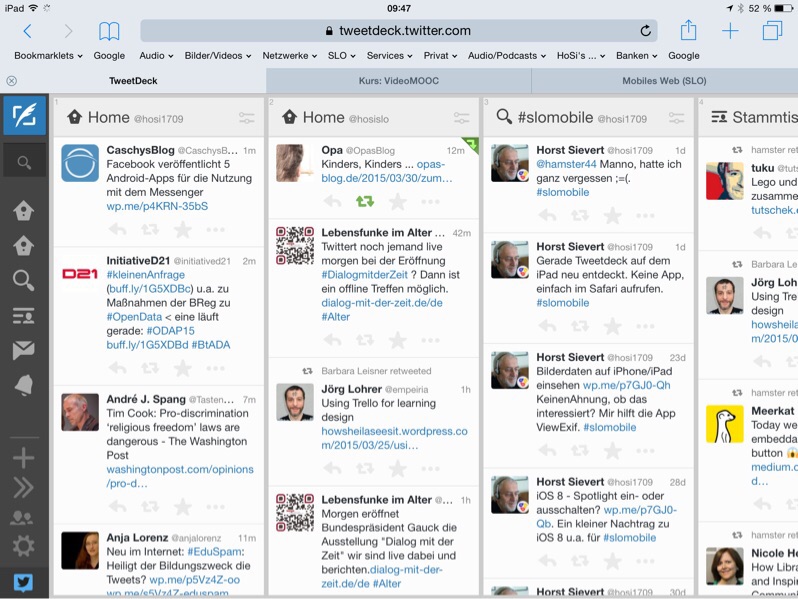 Seit einigen Jahren twittere ich überwiegend von iPhone oder iPad und nutze dort die Standard-App für Twitter. Diese App hat mindestens zwei Nachteile. Einerseits ist es etwas spannend mit zwei Accounts zu arbeiten, denn zum Umschalten muss man erst über den Knopf für den eigenen Account gehen und dort dann auf die „zwei Köpfe“ tippen. Ganz spannend wird es, wenn man einen Account mit einem Team bearbeiten möchte, denn dann muss man die Zugangsdaten an das gesamte Team weiterreichen. Jetzt ist mir mit TweetDeck ein alter Bekannter wieder eingefallen.