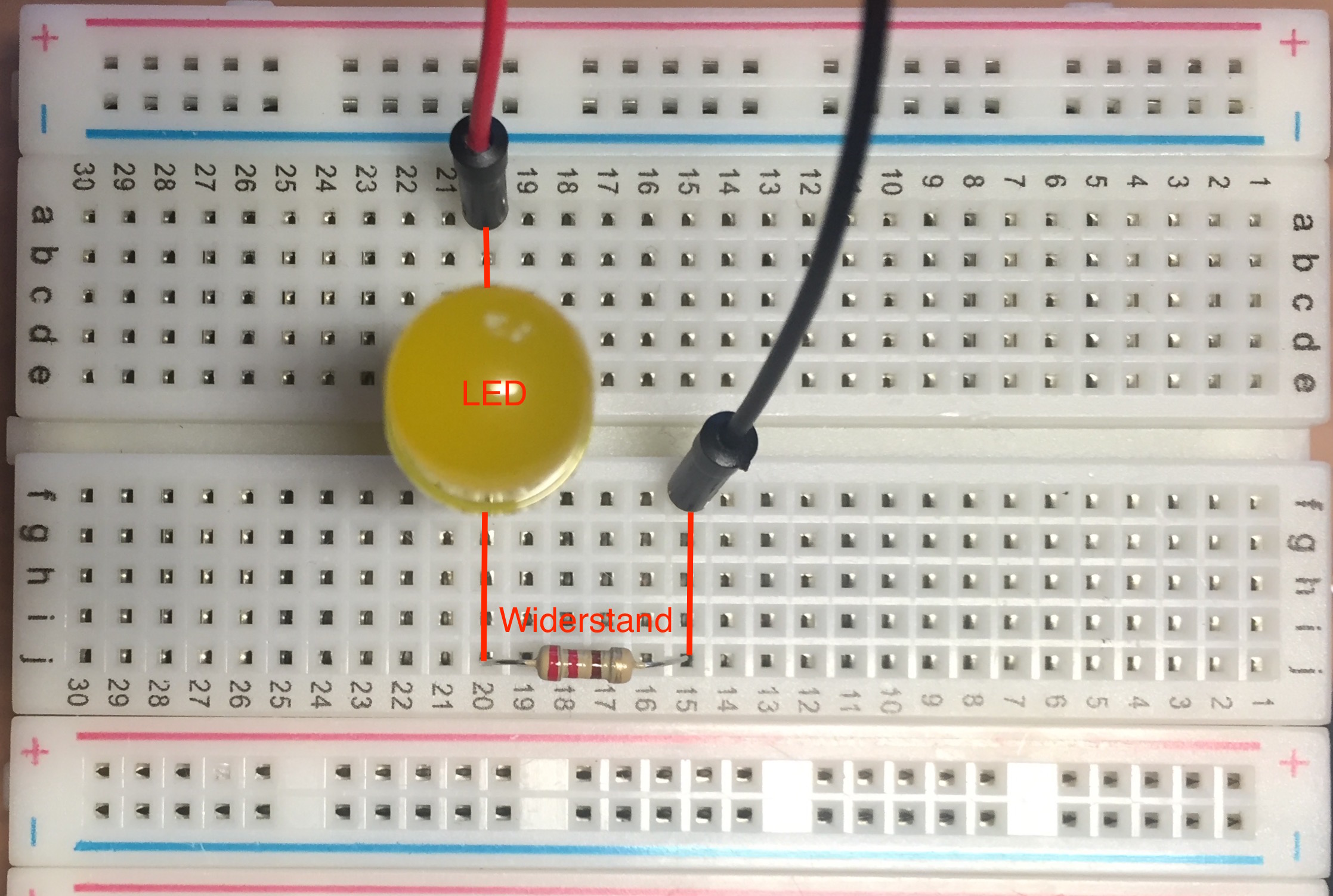 Im letzten Beitrag hatte ich versprochen, die Sache mit dem Raspberry Pi und seiner Gabe, zur Adventszeit die Lichtlein brennen zu lassen, gaaaanz einfach zu erklären. Den Start macht obiges Foto, das ein Steckbrett mit einem Widerstand und einer LED zeigt. Ich habe die Bauteile so gestreckt, dass sich ein Stromkreis ergibt, wenn man das rote und das schwarze Kabel an den Raspberry Pi anschließt.